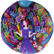 Гармоничная структура из множества разнородных цветных ячеек, удерживающихся в решетке из белых контуров. Некоторые из ячеек кажутся полупрозрачными и за ними смутно проглядывают спиралевидные орнаменты разных цветов. Есть среди них и те, что как будто стерты от времени, они не прозрачны и отражают свой собственный рисунок, накладывающийся на общий узор.