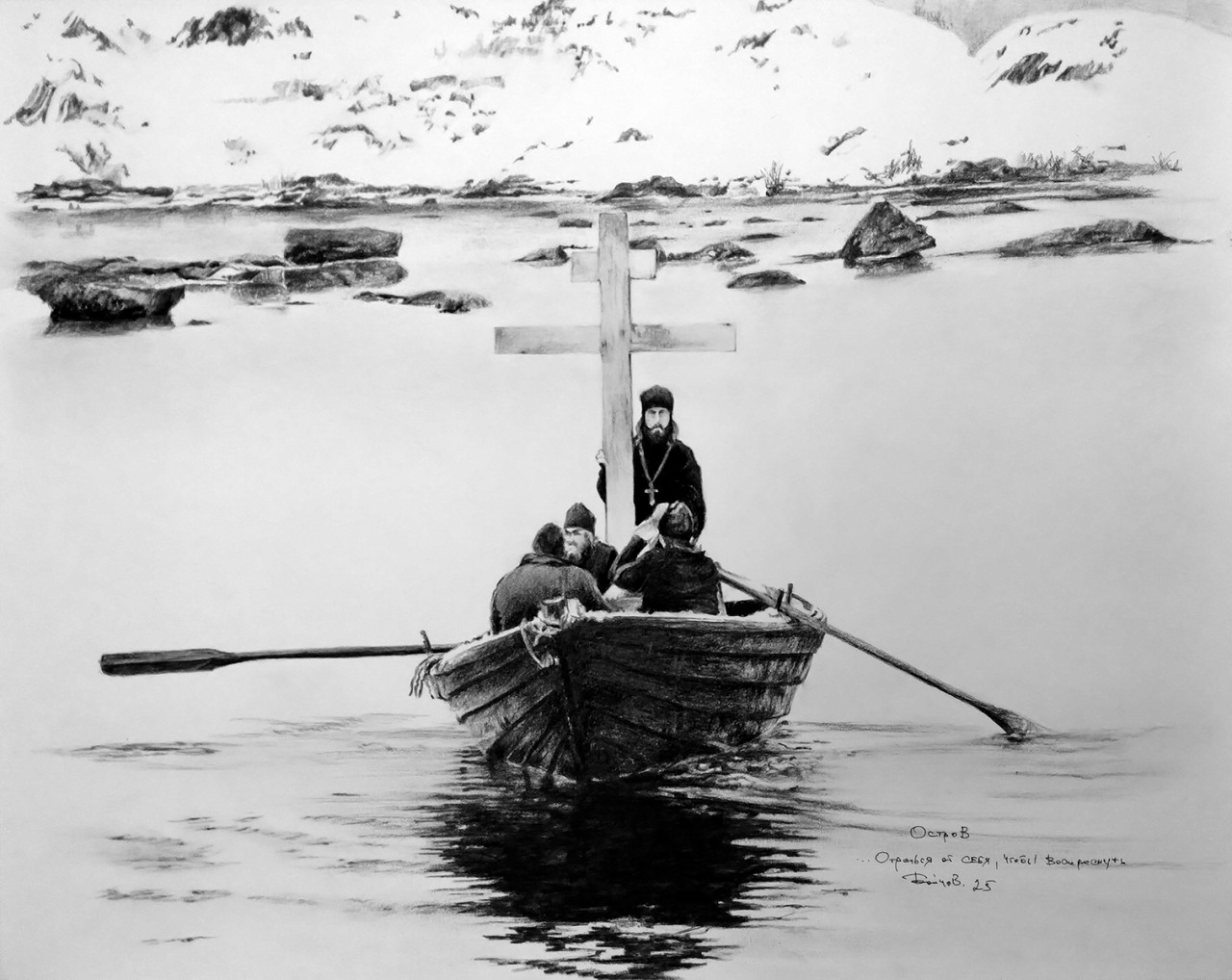 Первая. вид со спины. Старый седой человек раскинув руки стоит на вершине горы. Волосы его развиваются, он медленно рассыпается в прах. вторая. начало прошлого века. Несколько ...