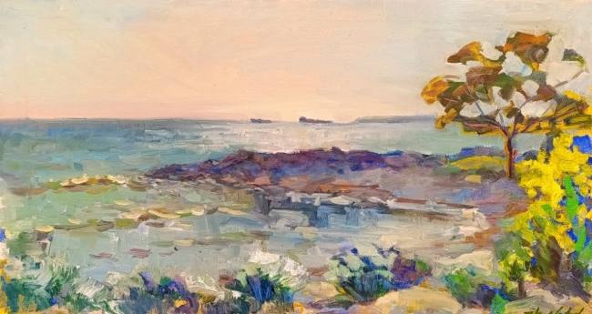 Здесь мне понравилась цветовая схема и воздух на волнорезе. Разногласия были в написании формы дерева, я его рисунок видела как веер, а Владимир — как овал. Поэтому откинула в копилку, оставив всё то хорошее, что на ней есть.