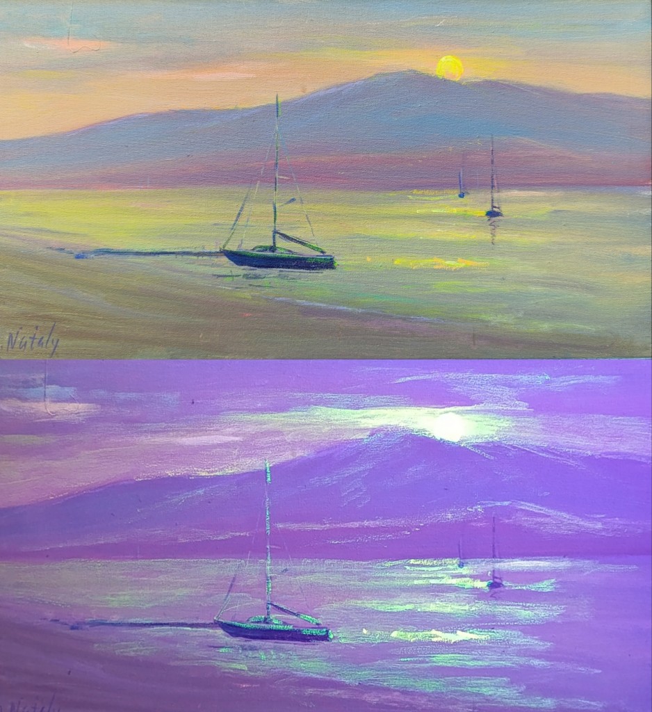 Нежный закат на побережье. Геленджик. День и ночь. Проект "светофизика в живописи" ZhNataly, светящаяся картина.