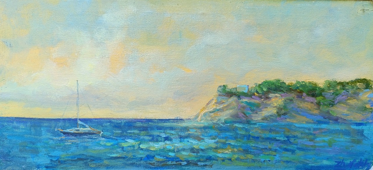 Небольшой этюд с натуры, мыс и море. Красивые были нежные облака, яхточка подплыла и стала на якорь, стаффаж нашёлся.