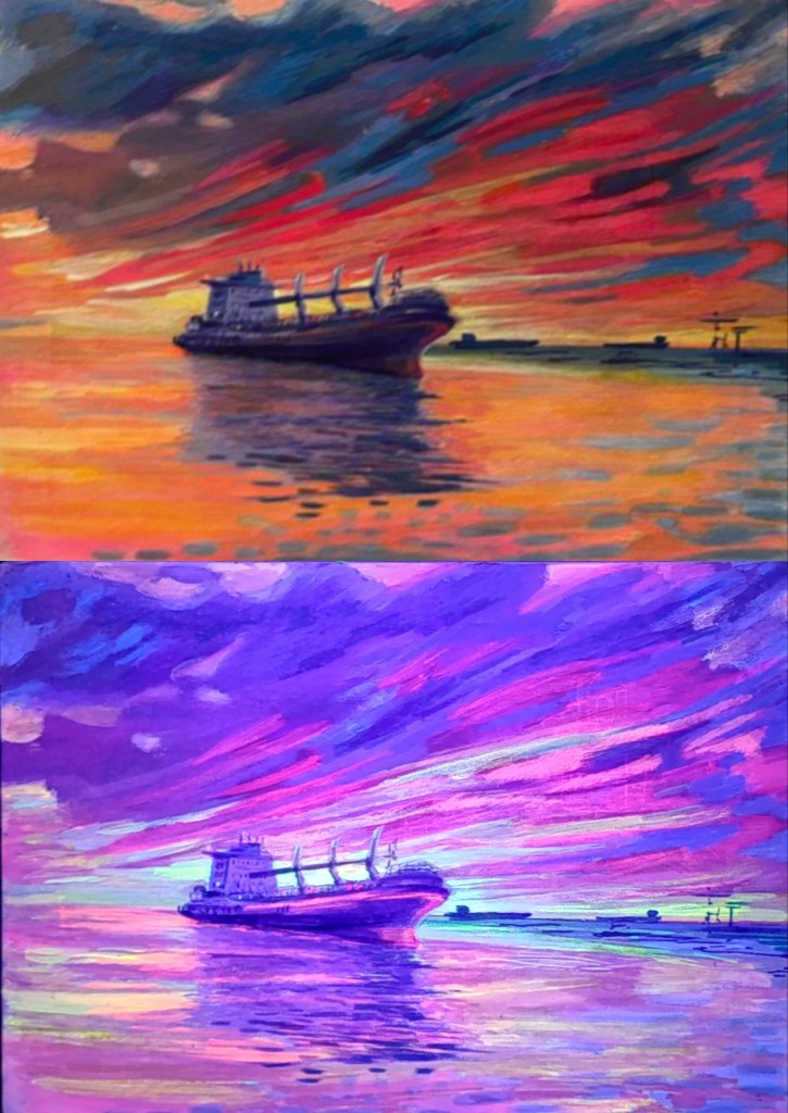 Сухогруз на закате. День и ночь. Проект «светофизика в живописи» ZhNataly. Светящаяся картина.