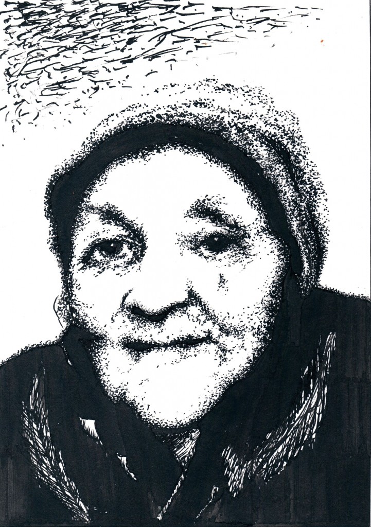 На этом черно-белом портрете изображена пожилая женщина - мать, чей взгляд устремлен прямо на зрителя. Лицо, выполненное с помощью тонкой точечной штриховки, передает глубину морщин и мягкость выражения, намекая на жизненный опыт и мудрость. Головной убор и одежда прорисованы плотными черными мазками, создавая контраст с текстурированной кожей. В верхней части композиции динамичные черные линии добавляют работе экспрессии, подчеркивая сосредоточенность образа. Тонкая игра света и тени придает портрету выразительность и эмоциональную насыщенность.