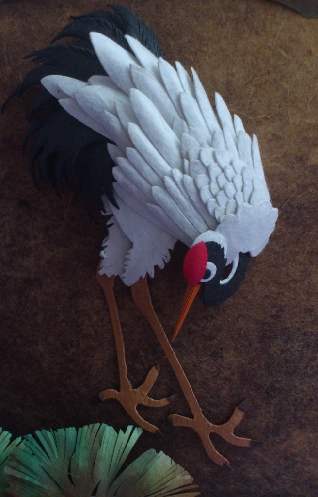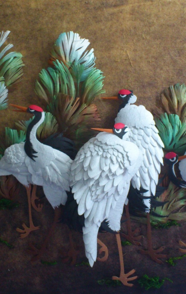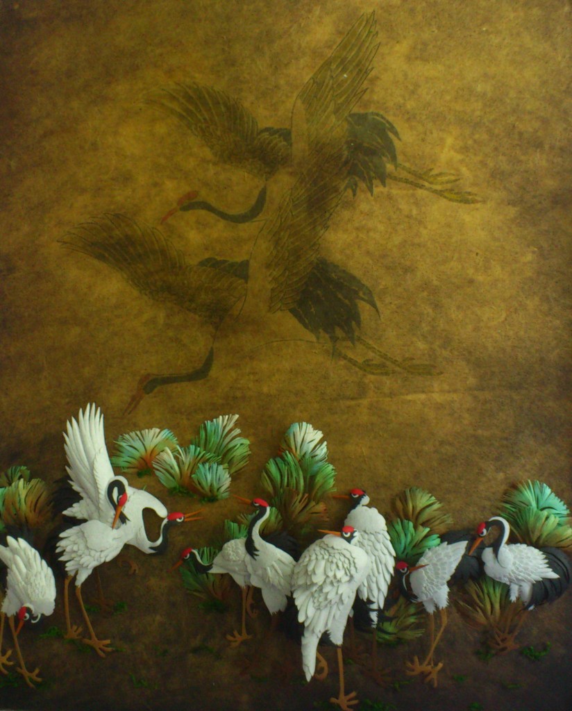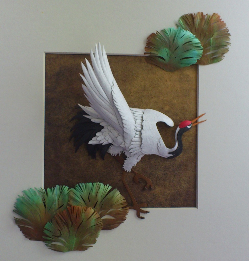 Бумагопластика. Школа лучших мастеров Кореи. Каждый элемент вырезан вручную особым образом из специальной двуслойной дизайнерской бумаги и потом собран в птицу. Фон- обожженая бумага ручной работы